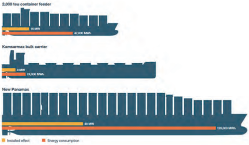 8、替代燃料:使用替代燃料能夠實現不同程度的減排,具體(tǐ)效果取決于燃料類型。如表1所示,不同類型的替代燃料具有(yǒu)不同的減排效果和(hé)優勢。圖1展示了各類船(chuán)舶的CO2總排放量預測值、所需的能效減排量及通(tōng)過節能裝置可(kě)能實現的減排量。所需的能效減排量與能效設計(jì)指數(shù)(EEDI)第三階段緊密相關,而該指數(shù)将于2025年對新船(chuán)生(shēng)效。據推測,通(tōng)過降低(dī)船(chuán)舶的裝機功率,可(kě)以達到EEDI第三階段的标準。相對于船(chuán)隊中的平均船(chuán)舶,EEDI第三階段對各類船(chuán)舶的節能要求分别為(wèi):集裝箱船(chuán)5%、散貨船(chuán)27%、油輪32%、液化天然氣船(chuán)34%。
