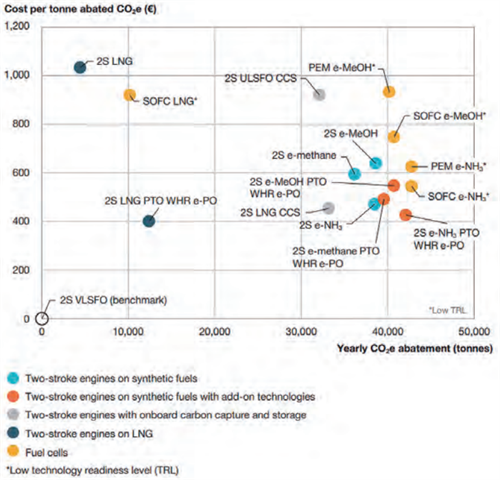 根據圖3,二沖程雙燃料發動機使用合成氨燃料的絕對減排潛力為(wèi)每年約92千噸CO2當量,減排成本為(wèi)每噸460歐元。若在二沖程氨燃料發動機中集成PTO軸帶發電(diàn)、廢熱回收和(hé)合成引燃油噴射技(jì)術(shù),每年可(kě)減少(shǎo)多(duō)達102千噸CO2當量,減排成本降低(dī)至每噸450歐元。然而,這種配置會(huì)使推進方案變得(de)更為(wèi)複雜。對于一些(xiē)發動機運營商而言,标準氨燃料發動機因其簡潔性比有(yǒu)多(duō)種附加技(jì)術(shù)的發動機更受歡迎。對于二沖程甲醇發動機,其絕對減排量為(wèi)每年約93千噸,成本為(wèi)每噸640歐元。電(diàn)制(zhì)甲烷的絕對減排量也約為(wèi)每年93千噸,成本為(wèi)每噸500歐元。若采用相同的節能技(jì)術(shù),甲醇和(hé)電(diàn)制(zhì)甲烷的絕對減排量分别增至98千噸和(hé)96千噸,成本則分别降至每噸590歐元和(hé)每噸510歐元。