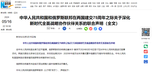 據新華社等報道(dào),5月16日,國家(jiā)主席習近平在北京人(rén)民大(dà)會(huì)堂同來(lái)華進行(xíng)國事訪問的俄羅斯總統普京舉行(xíng)會(huì)談。會(huì)談後,兩國元首共同簽署并發表《中華人(rén)民共和(hé)國和(hé)俄羅斯聯邦在兩國建交75周年之際關于深化新時(shí)代全面戰略協作(zuò)夥伴關系的聯合聲明(míng)》(簡稱聯合聲明(míng))。