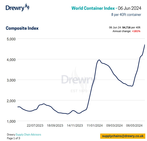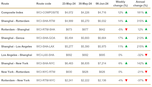 Drewry世界集裝箱指數(shù)(WCI)本周(截至6月6日)上(shàng)漲12%至4,716美元/FEU,與2022年同期相比上(shàng)漲了181%,并且比2019年疫情前1,420美元/FEU的平均水(shuǐ)平高(gāo)出232%。