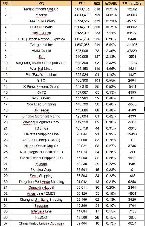 全球班輪公司運力百強最新排名(2024年6月)