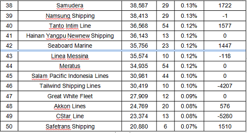 排名第11至20名依次為(wèi):萬海航運、太平船(chuán)務、海豐國際、X-Press Feeders Group、高(gāo)麗(lì)海運(KMTC)、伊朗國航(IRISL)、Sea Lead Shipping、UniFeeder、長錦商船(chuán)和(hé)中谷海運。