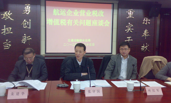 本網站(zhàn)訊 2012年3月23日,交通(tōng)運輸部在上(shàng)海召開(kāi)“航運企業營業稅改增值稅有(yǒu)關問題”的座談會(huì),交通(tōng)運輸部水(shuǐ)運局國內(nèi)處葉紅軍處長主持會(huì)議。中國船東協會長江分會張守國常務副會(huì)長兼秘書(shū)長出席會(huì)議并作(zuò)重要發言。上(shàng)海市交通(tōng)運輸和(hé)港口管理(lǐ)局朱建華巡視(shì)員、交通(tōng)運輸部财務司綜合處李麗(lì)副處長、交通(tōng)财政與金融研究所胡方俊所長出席了會(huì)議。